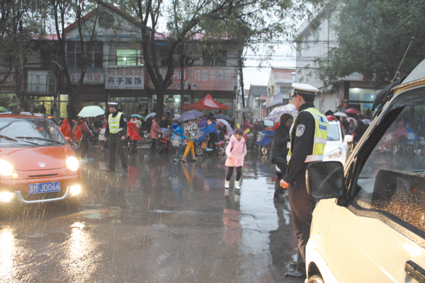 当日17时许,正值学生放学高峰期,大雨连续下的不停,接送学生车辆猛增,随时会出现交通拥堵现象,县公安局交警大队立即调集警力,启动恶劣天气应急预案措施,指派城镇中队、公路巡警一中队民警全员上岗,并由分管领导督导、各中队长带头在城区实验一小、实验二小、实验三小、县直初中等重点学校门口指挥疏导交通。