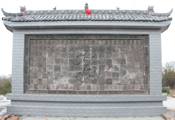 此照壁高5.8米,宽6.8米,厚0.8米。照壁的正面是有"天下第一福"之称的康熙御笔"福"字。此"福"的书写不同于民间常用的饱满方正,其字形窄而狭长,为瘦,音谐"寿",民间称之"长瘦福",即长寿之福。而且,此"福"字在写法上暗含"子、田、才、寿、福"五种字形,寓意"多子、多田、多才、多寿、多福",从书法角度看,将数个字合为一体却流畅自然,已属罕见,更为珍稀的是,这也是世上惟一的"五福合一"、"福寿合一"之"福",它又被称为"长寿福"和"天下第一福"。俗语称"有福必有寿,有寿必有福。有福无寿是为无福可受"。但是,由于"福","寿"二字字形差异太大,因此,自古以来很少有书法家将其合二为一,可康熙所写此"福",恰恰将福、寿两字形为一体,做到"福中有寿,福寿双全"。有意思的是这个福除了可理解为寿外,还可分解成"才"、"子"、"多"、"田"四个字,有"多子多才多田多福多寿"。五福之寓,巧妙地构成了"福"字的深刻含义,意味深长,是古往今来独一无二的"五福"合一之"福"字,因而被世人公认为"天下第一福"。又因其中的"田"部尚未封口,因此是鸿福无边、无边之福。孝庄太后称其为"福之本源",民间则称"五福之本、万福之源"。在康熙御笔"福"字的四角,分别雕刻着四只蝙蝠,含义"遍福",代表幸福如意或幸福延绵无边。外围是四朵莲花,象征着纯洁与高雅、清净和超然。周边是108个因形立意、体正势圆、无一重复的篆刻"福"字,寓示着全村众户千秋百代永远幸福。