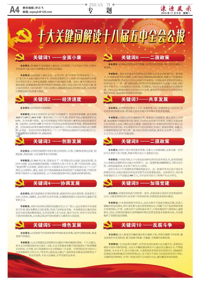 专家解读:中央党校教授辛鸣表示,此次公报中不是就发展说发展,而是大篇幅涉及党的建设,将中国发展与党的领导紧密结合,明确了共产党在国家发展中的领导核心作用。在落实四个全面的新布局下,中国发展好坏与领导核心直接相关,因此,加强党的建设以及明确新时期治党管党的基本思路和办法,为发展提供了坚强的政治保障。
