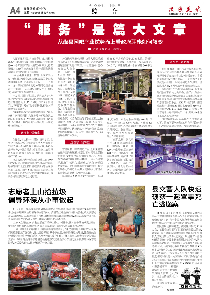 搭建发展平台,促进品牌建设,是主管部门创新职责的方向所在。基于此,绛县文化市场行政综合执法队做了大量努力。由执法队牵头发动,网吧经营者积极参与绛县青年志愿者队伍中去。2013年,他们深入南樊镇北柳村,捐赠500册图书和价值500元的体育器材;2014年,集资2000元,对两名贫困家庭学生进行资助;2015年,组织50名留守儿童进影院看电影……