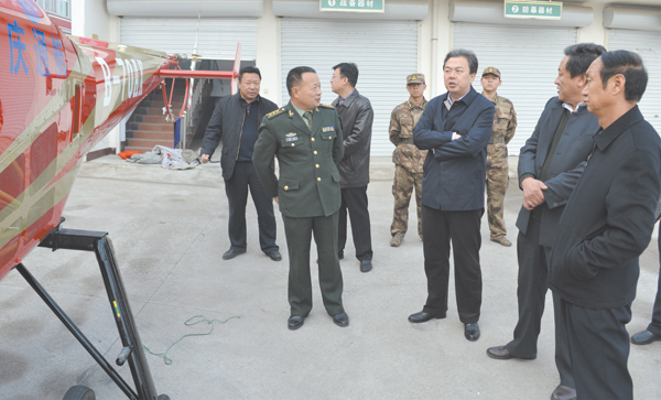 本报讯 11月16日,县委书记、县长卫再学,县委副书记、统战部长秦志洲,县政协主席李服役,县委常委、人武部政委陈军,政府副县长王述江来到县人武部院内,参观了通用航空飞机展示。
