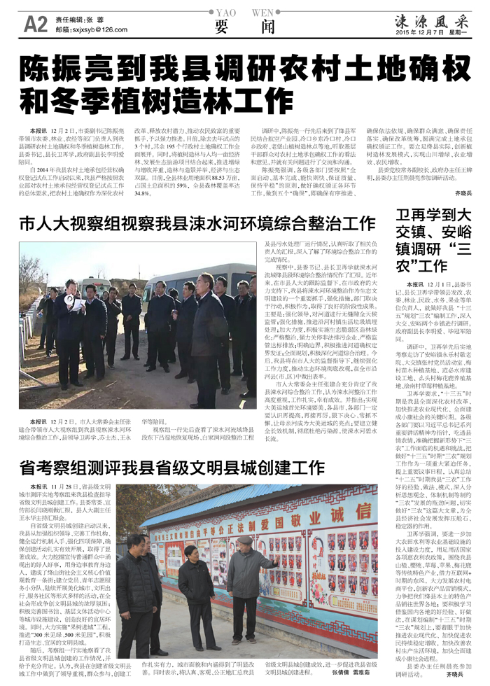 随后,考察组一行实地察看了我县省级文明县城创建的工作情况,并给予充分肯定。认为,我县在创建省级文明县城工作中做到了领导重视,群众参与,创建工作扎实有力,城市面貌和内涵得到了明显改善。同时表示,将认真、客观、公正地汇总我县省级文明县城创建成效,进一步促进我县省级文明县城创建进程。 张倩倩 雷雅茹