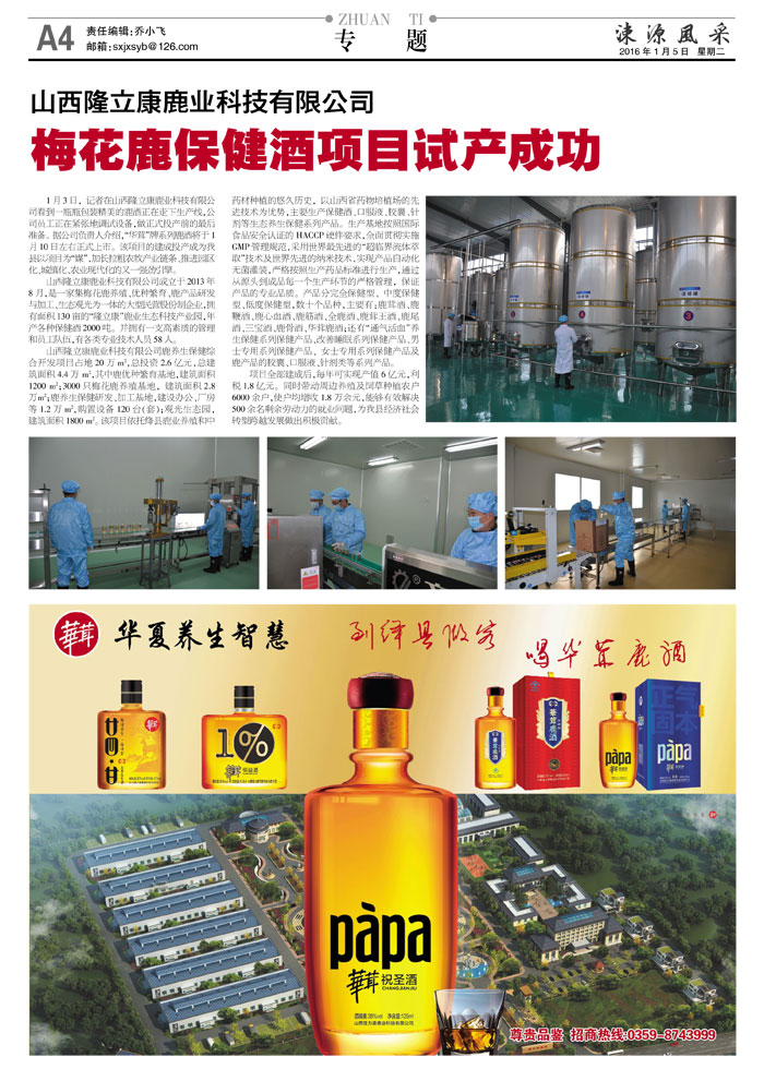 山西隆立康鹿业科技有限公司梅花鹿保健酒项目试产成功