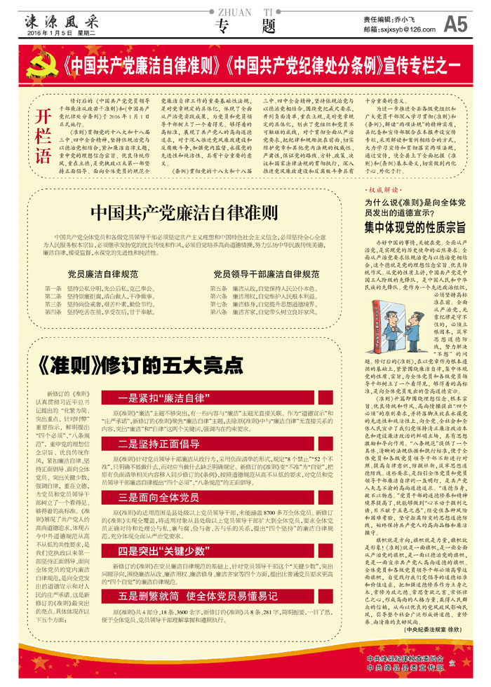 开栏语 修订后的《中国共产党党员领导干部廉洁从政若干准则》和《中国共产党纪律处分条列》于2016年1月1日正式施行。