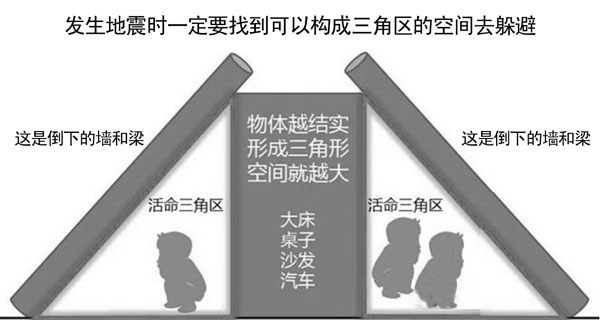 在室内房屋倒塌后所形成的三角空间,往往是人们得以幸存的相对安全地点,可称其为避震空间。这主要是指大块倒塌体与支撑物构成的空间。通过室内易于形成避震空间的地方包括内墙(特别是承重墙)墙根、墙角;厨房、厕所、储藏室等空间小、有管道支撑的地方;炕沿下,结实牢固的家具附近。最不利于避震的室内空间包括:附近没有支撑物的床上、炕上;周围无支撑物的地板上;外墙边、窗户旁。