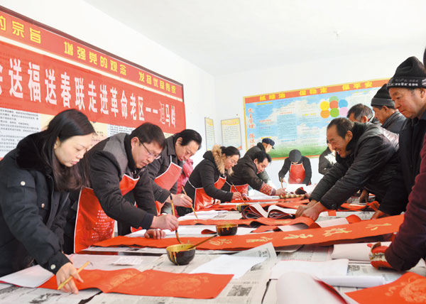 1月25日,县委宣传部、县文联牵头组织县文化馆、书协、美协、老年书协等多家单位的书法名家,齐聚绛县廻马岭移民新村,义务为革命老区群众书写春联、送祝福!