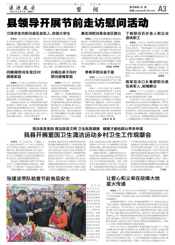 本报讯 1月27日,县委书记、县长卫再学走访慰问了我县抗日战争、解放战争、建国时期的老军人及贫困大学生,向他们送去新春的祝福。县委常委、政府常务副县长丁格一同前往。