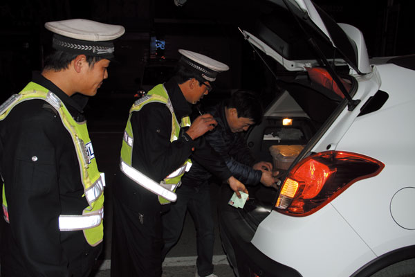 图为县公安局交警大队集中行动日民警夜间检查车辆