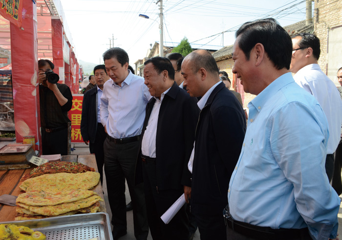 图为市委常委、宣传部长于波,市外事侨务和文物旅游局局长李苏杰,县领导卫再学、薛玉马等在东华山古庙会绛县名吃摊位前了解商户经营情况。 康保平