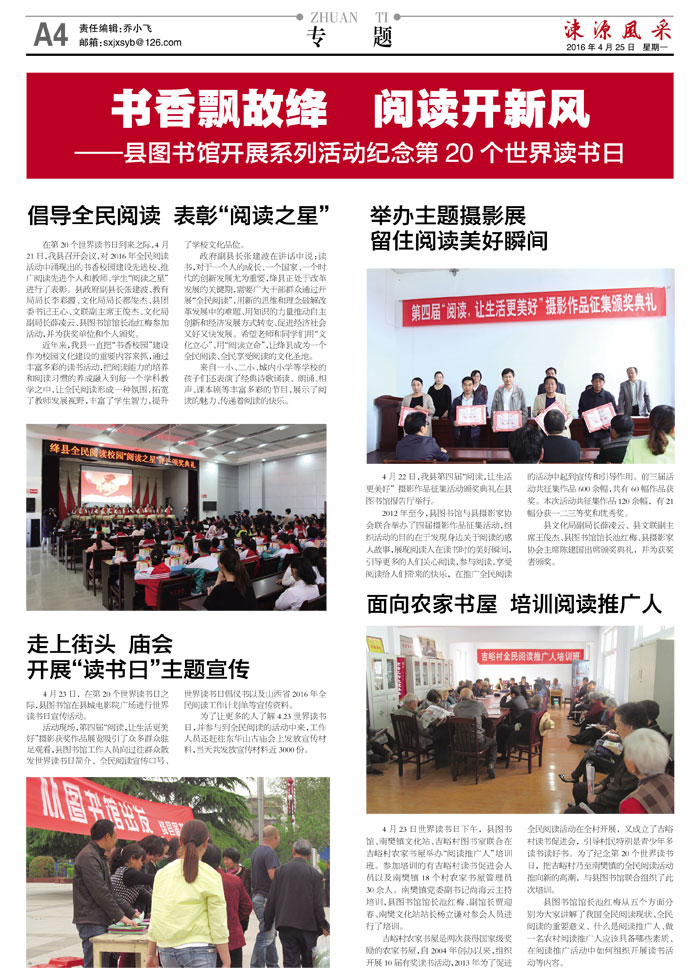 在第20个世界读书日到来之际,4月21日,我县召开会议,对2016年全民阅读活动中涌现出的书香校园建设先进校、推广阅读先进个人和教师、学生“阅读之星”进行了表彰。县政府副县长张建波、教育局局长李彩霞、文化局局长都俊杰、县团委书记王心、文联副主席王俊杰、文化局副局长薛凌云、县图书馆馆长池红梅参加活动,并为获奖单位和个人颁奖。