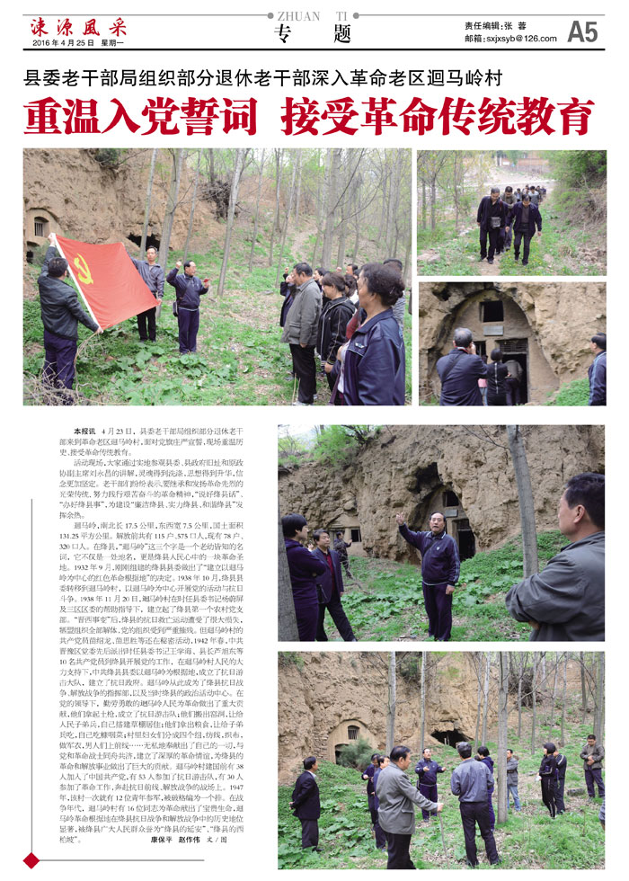 本报讯 4月23日,县委老干部局组织部分退休老干部来到革命老区迴马岭村,面对党旗庄严宣誓,现场重温历史、接受革命传统教育。