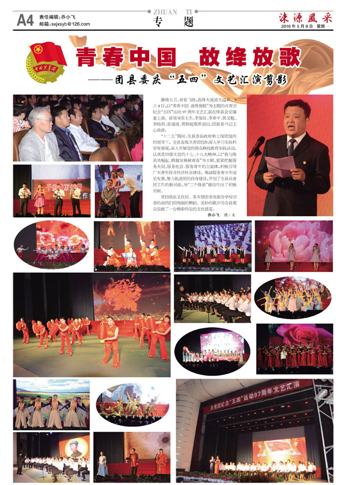 激情五月,青春飞扬,故绛大地流光溢彩。5月4日,以“青春中国 故绛放歌”为主题的共青团纪念“五四”运动97周年文艺汇演在绛县会堂隆重上演。县领导苏士杰、李服役、李希平、郭文魁、李晓燕、张建波、贺照庭观看演出,团县委书记王心致辞。