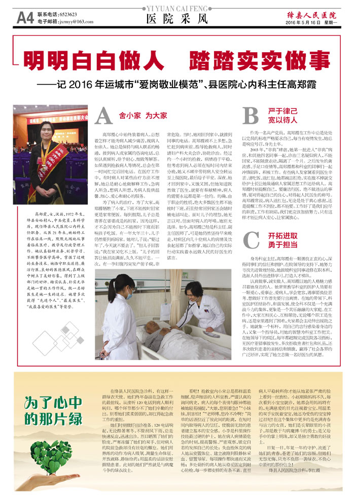 明明白白做人 踏踏实实做事——记2016年运城市“爱岗敬业模范”、县医院心内科主任高郑霞