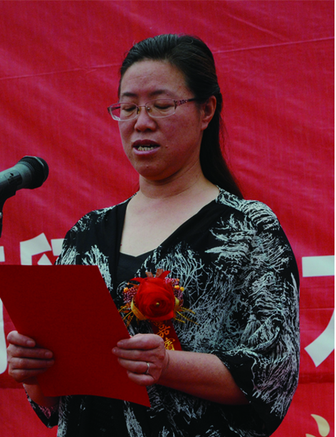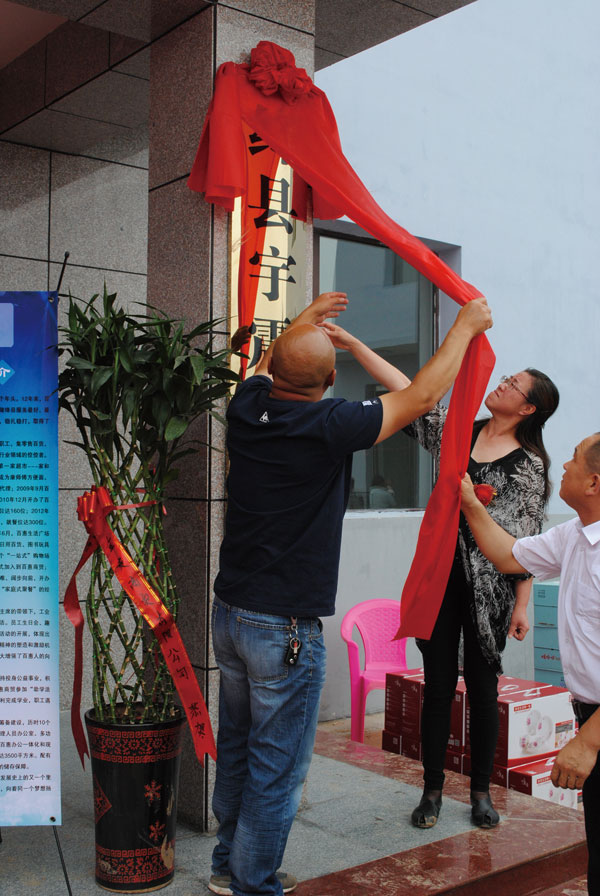 百惠商贸总经理王俊玲、城内村党支部书记王云志为百惠商贸公司办公大楼竣工揭牌