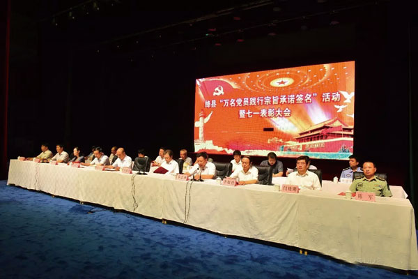本报讯 6月28日,我县举行“万名党员践行宗旨承诺签名”活动暨“七一”表彰大会,活动号召全县各级党组织和党员干部一定要牢记使命、担当责任,要求从严、约束从紧、工作从实,以更加高昂的热情、更加务实的举措,积极投身到建设“四个基地”的发展实践之中,为全面实现绛县小康社会而努力奋斗!