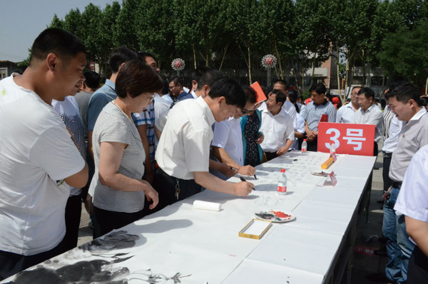 在县电影院广场,来自全县各条战线的近万名党员齐聚这里,学党章、唱红歌、颂党恩,并在60米长的党建主题书画长卷上郑重签名承诺,“弘扬优良传统,做合格共产党员”共同庆祝党的95岁生日。