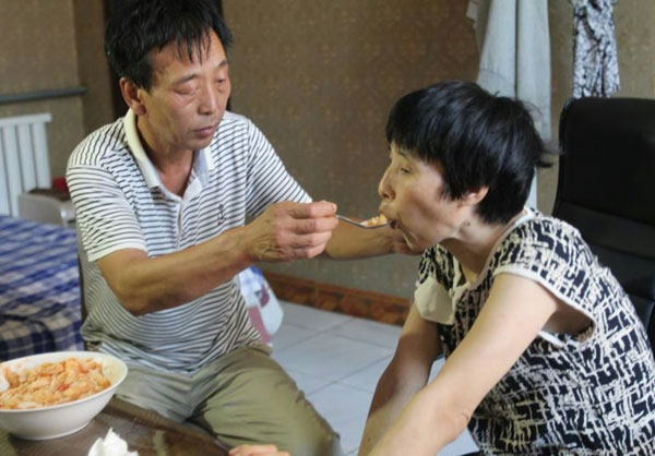 李艳秋丈夫王铁师每天要给妻子做八九顿饭,一刻也不能离开,这样的日子已经过了三年了。