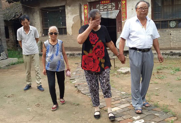 与李艳秋同住横水镇上的舅舅孙双喜(右一)和丈夫王铁师(左一)来到35公里外的安峪镇董封村,看望艳秋的母亲(右二)、伯母。