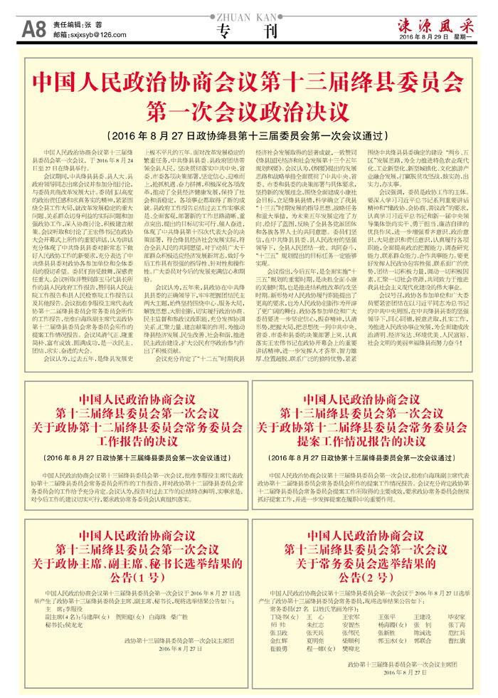 中国人民政治协商会议第十三届绛县委员会第一次会议关于政协主席、副主席、秘书长选举结果的公告(1号)