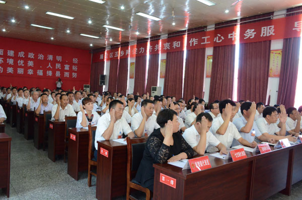 当天,绛县会堂内气氛庄重而热烈,主席台帷幕中央国徽高悬,十面鲜艳的红旗分列两侧。