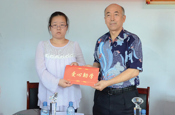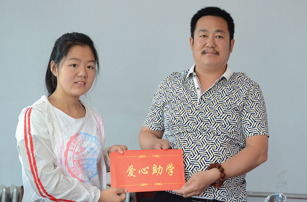 绛县工商联常委、山西中条欧李研究开发中心董事长梁学文向受助大学生捐助助学金。