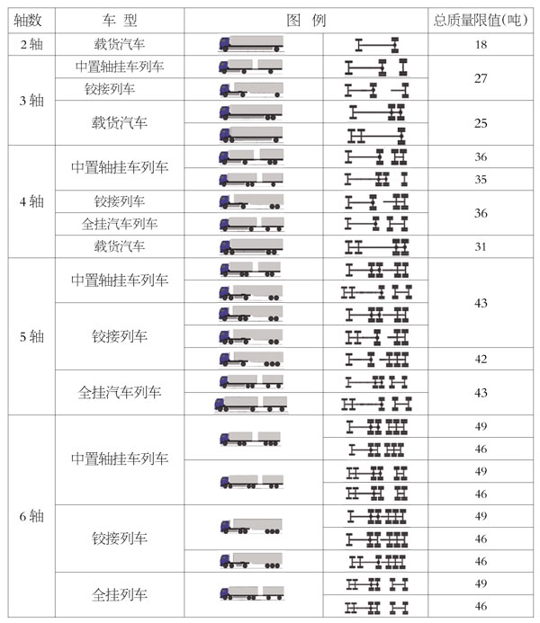 5、图例中未列车型,根据《汽车、挂车及汽车列车外廓尺寸、轴荷及质量限值》(GB1589-2016)规定,确定相应的总质量限值。