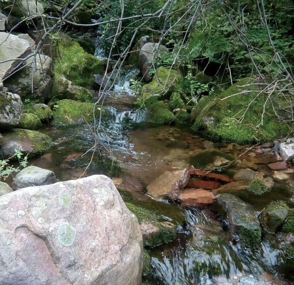 上坡,转弯,跨沟,越涧,穿过狭窄的林中密道,突然让人豁然开朗,同我们一起的镇党委书记王泰说,晋源坪到了。这是密林围裹的一片绿地,地势开阔平坦,植被茂密如茵,面积约十几亩大,是北方地区标准的高山草甸,站在嫩绿的青草坪上,迎面是一株千年古松,粗壮挺拔的树干向上3米处,两股枝干自然分开,呈双劈迎客姿态,很是让人惊奇,古松脚下,是股欢快奔跳的溪流。