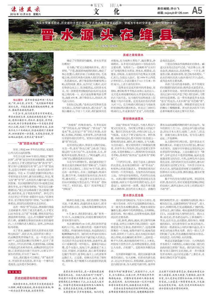 核心提示 最早的晋国在哪里?司马迁说:“河、汾之东,方百里。”我们探秘早期晋国水之源,只能在隶属晋国故地的绛县、曲沃、翼城等县疆域内启步。
