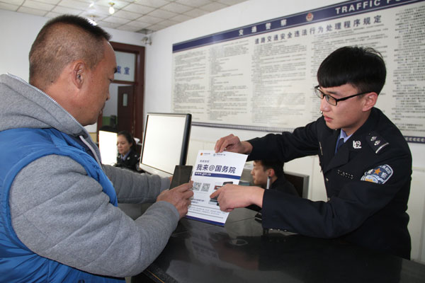 当日下午,县交警大队宣教股在大队车管所、秩序违法处理大厅等“窗口”股室民警配合下,利用张贴“简政放权”海报和发放彩页,开展“简政放权,我来@国务院”意见征集活动,为前来办理业务群众讲解“简政放权,我来@国务院”的目的和意义,通过扫描中国政府网和下载国务院手机APP客户端,让更多群众能主动参与此项活动。