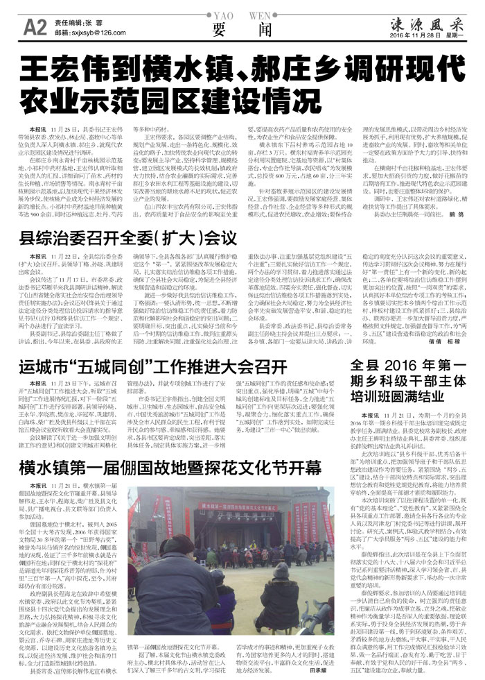 本报讯 11月25日,县委书记王宏伟带领县农委、农发办、林业局、畜牧中心等单位负责人深入到横水镇、郝庄乡,就现代农业示范园区建设情况进行调研。