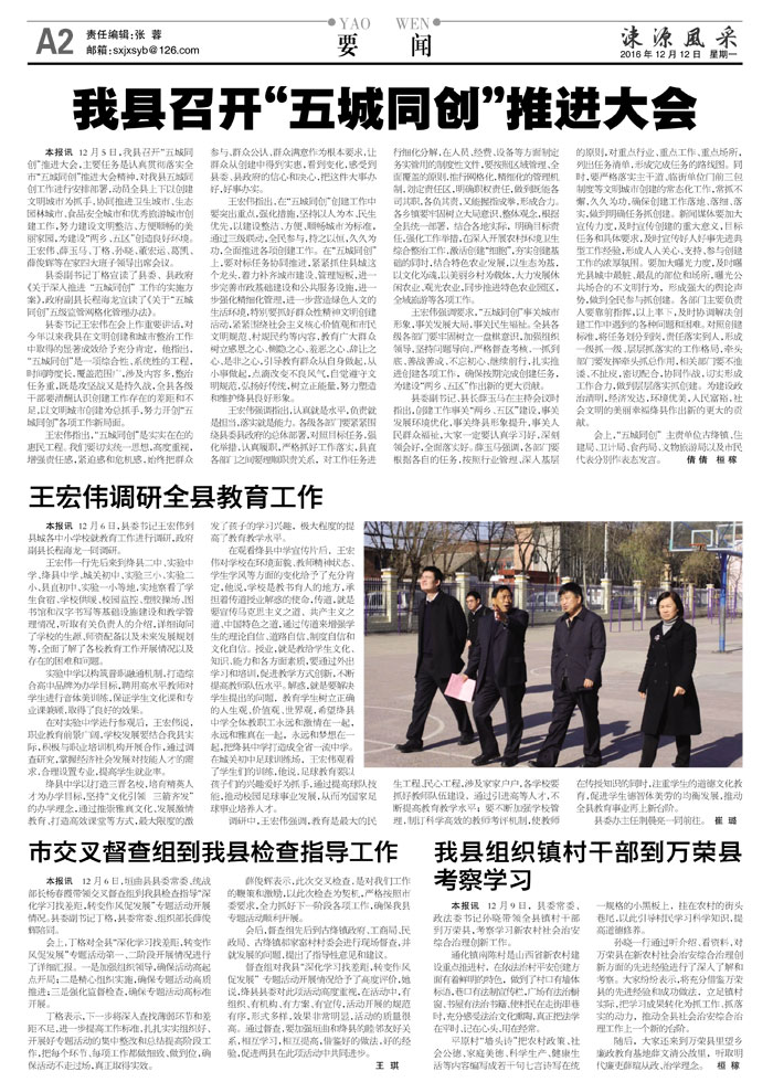 王宏伟指出,在“五城同创”创建工作中要突出重点,强化措施,坚持以人为本、民生优先,以建设整洁、方便、顺畅城市为标准,通过三级联动,全民参与,持之以恒,久久为功,全面推进各项创建工作。在“五城同创”上,要对标任务协同推进,紧紧抓住县城这个龙头,着力补齐城市建设、管理短板,进一步完善市政基础建设和公共服务设施,进一步强化精细化管理,进一步营造绿色人文的生活环境,特别要抓好群众性精神文明创建活动,紧紧围绕社会主义核心价值观和市民文明规范、村规民约等内容,教育广大群众树立感恩之心、恻隐之心、羞恶之心、辞让之心、是非之心,引导教育群众从自身做起,从小事做起,点滴改变不良风气,自觉遵守文明规范,弘扬好传统,树立正能量,努力塑造和维护绛县良好形象。