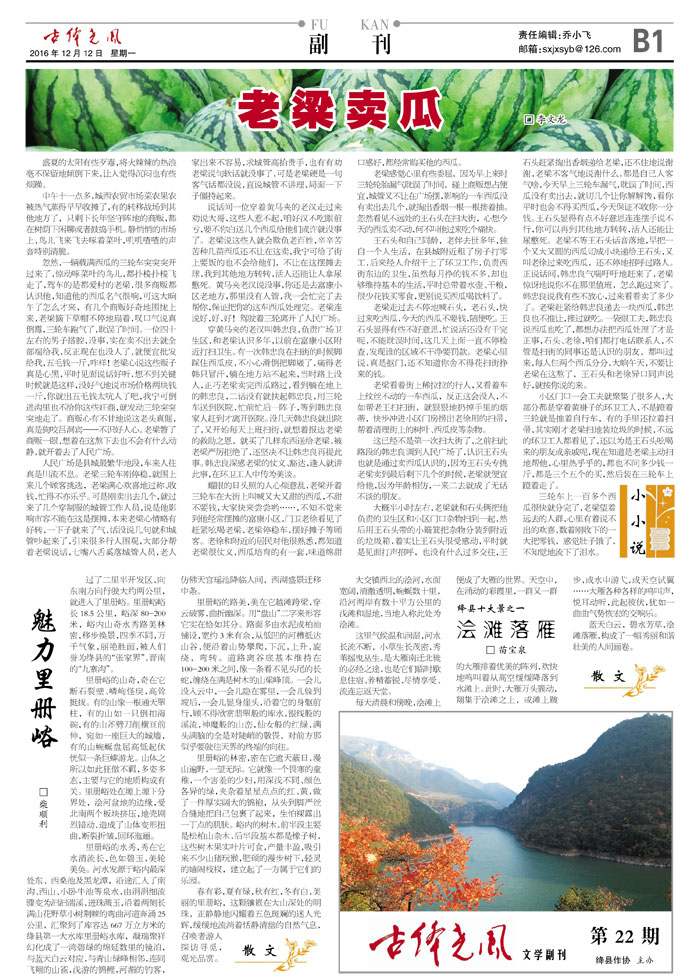 耀眼的日头照的人心烦意乱,老梁开着三轮车在大街上叫喊又大又甜的西瓜,不甜不要钱,大家快来尝尝哟……,不知不觉来到他经常摆摊的富康小区,门卫老徐看见了赶紧吆喝老梁,老梁停稳车,摆好摊子等顾客。老徐和附近的居民对他很熟悉,都知道老梁很仗义,西瓜培育的有一套,味道绵甜口感好,都经常购买他的西瓜。