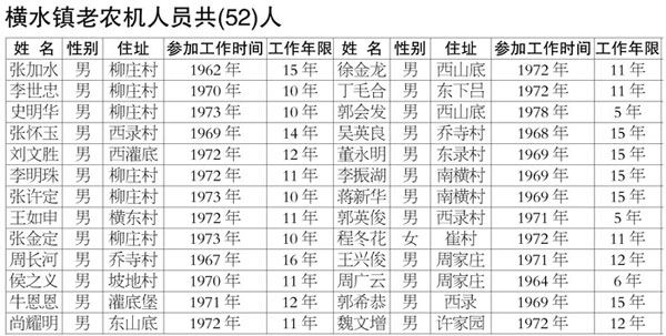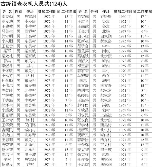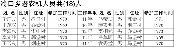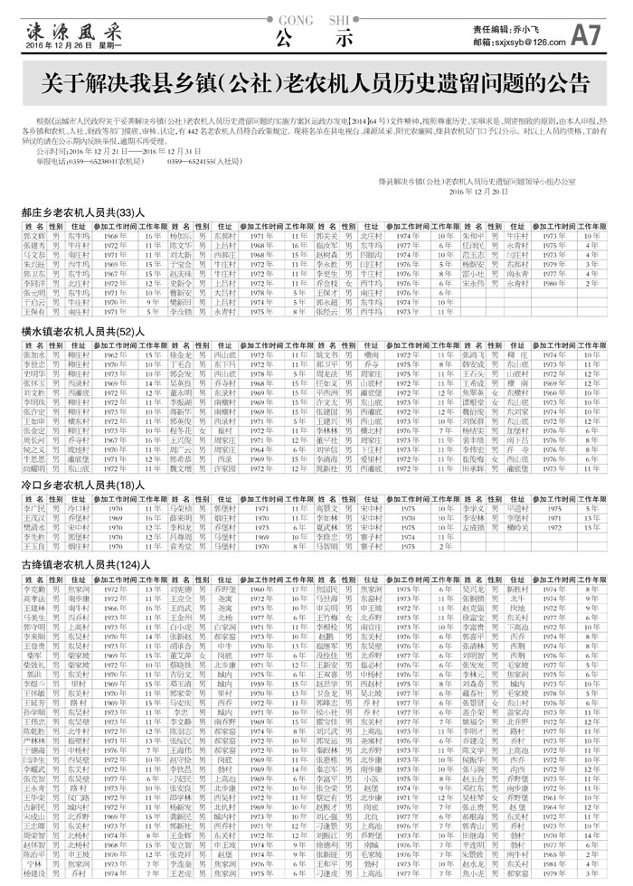 根据《运城市人民政府关于妥善解决乡镇(公社)老农机人员历史遗留问题的实施方案》(运政办发电【2014】64号)文件精神,按照尊重历史、实事求是、周密细致的原则,由本人申报,经各乡镇和农机、人社、财政等部门摸底、审核、认定,有442名老农机人员符合政策规定。现将名单在县电视台、涑源风采、阳光农廉网、绛县农机局门口予以公示。对以上人员的资格、工龄有异议的请在公示期内反映举报,逾期不再受理。