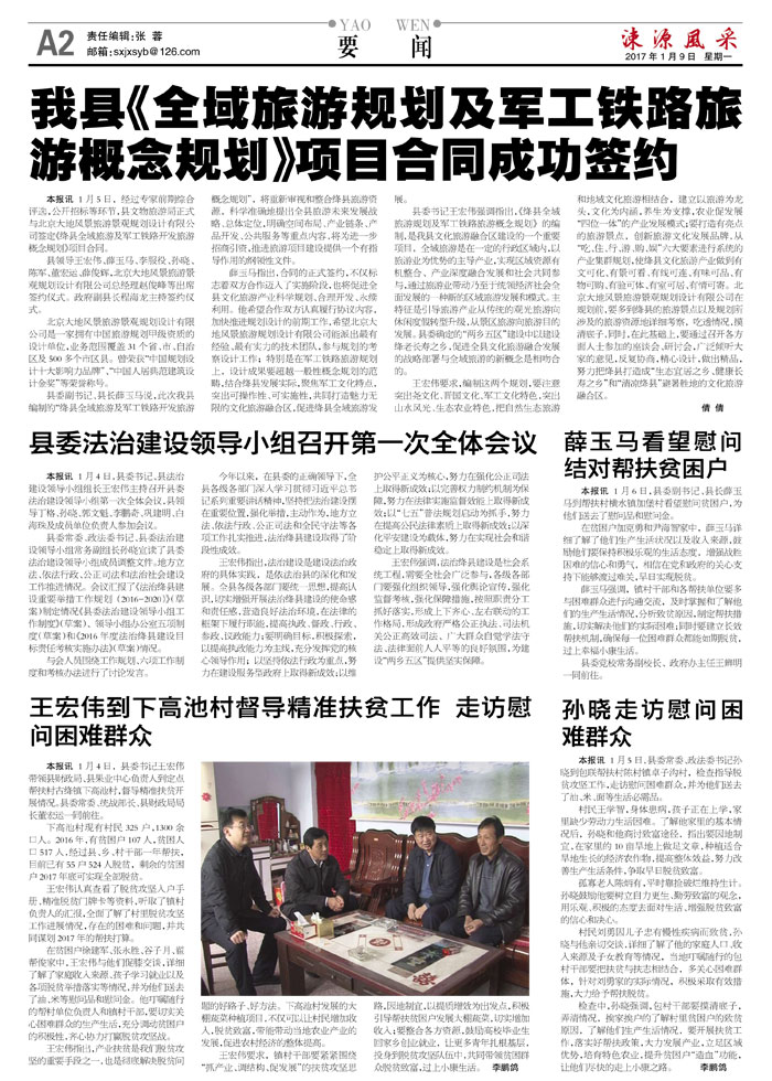 本报讯 1月5日,经过专家前期综合评选,公开招标等环节,县文物旅游局正式与北京大地风景旅游景观规划设计有限公司签定《绛县全域旅游及军工铁路开发旅游概念规划》项目合同。
