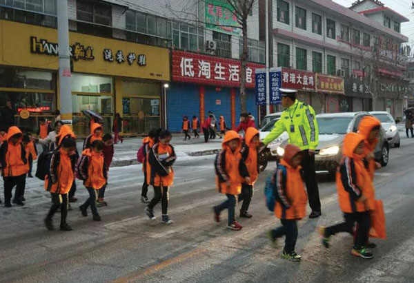 2月21日,降雪天气给上学的孩子们出行带来诸多不便,为确保全县雪天涉校事故零发生,县公安局交警大队提前谋划、周密部署,城镇中队护学岗的民警们更是提前40分钟到岗,为雪天学生安全上下学铺设了一条交通安全防护线。早7点,在县实验一小、实验二小、实验三小、县直初中等学校门前,城镇中队民警一边指挥川流不息的车辆给孩子们留出安全通道,一边组织孩子们分小组排好队,两名交警一个排头、一个排尾,护送一拨又一拨学生安全有序横过马路、走进校园。