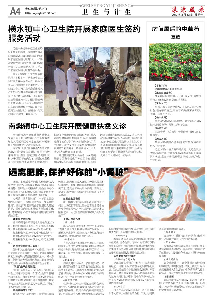 为了让家庭医生签约服务政策深入各村各户,横水镇中心卫生院采取各种宣传方式让群众充分认识到家庭医生的重要性。卫生院工作人员于启动会后进村入户对每村的慢性病真实性进行检查,并结合村医开展以“以家庭医生签约服务为宗旨,跟踪慢性病患者随访,提供公共卫生知晓率”为主题的健康教育活动。由于宣传到位,措施得力,在短短的几天时间内就签约了4700余户。