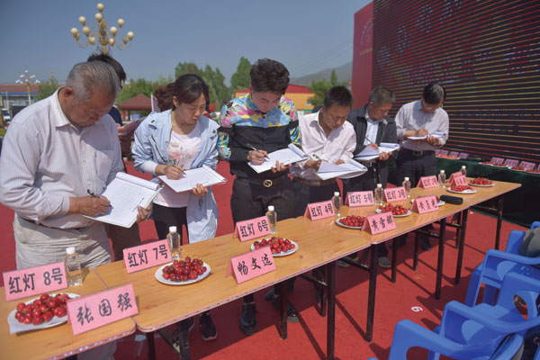 眼观、品尝,来自郑州果树研究所研究员黄贞光等7位专家围着摆满了27份绛县大樱桃的长桌,走了一圈又一圈,尝了一遍又一遍,他们根据自己多年从事樱桃种植研究的经验,来选拔出绛县首届樱桃文化节的“樱桃之王”。
