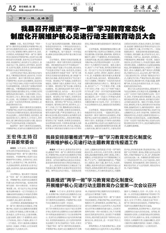 我县安排部署推进“两学一做”学习教育常态化制度化开展维护核心见诸行动主题教育宣传报道工作