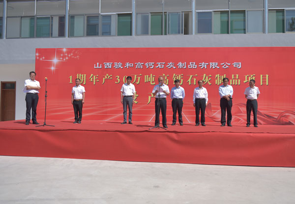 县委书记王宏伟宣布骏和公司一期年产30万吨高钙石灰制品项目正式投产。