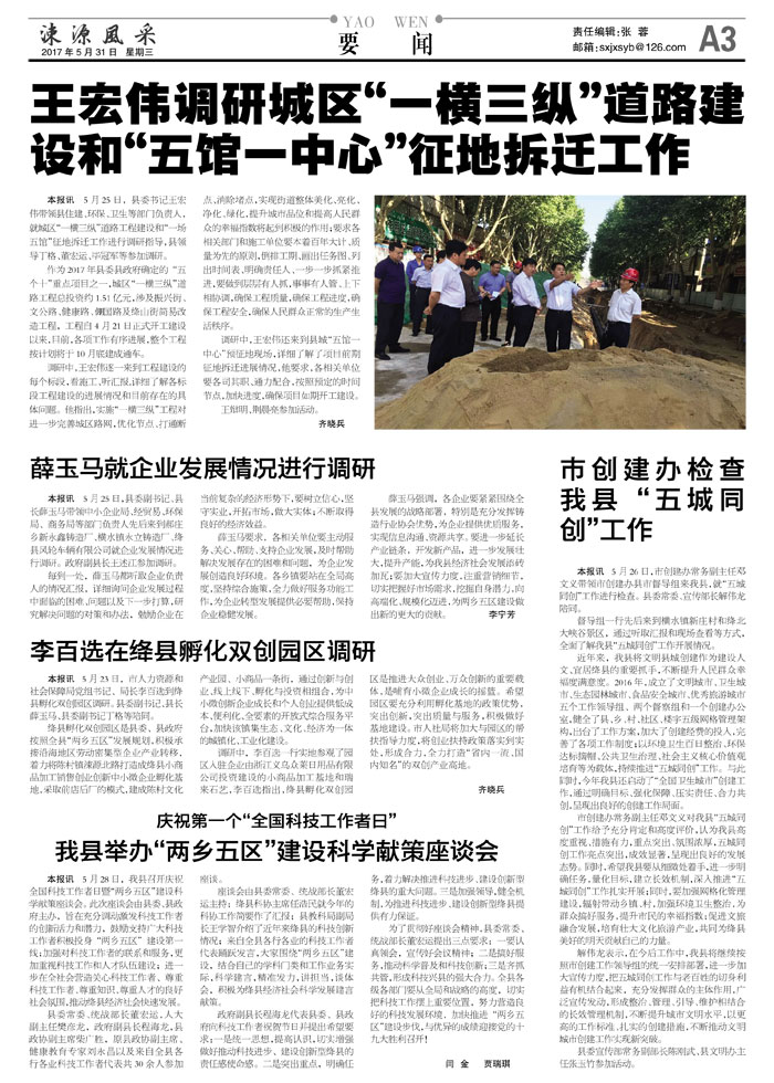 本报讯 5月25日,县委书记王宏伟带领县住建、环保、卫生等部门负责人,就城区“一横三纵”道路工程建设和“一场五馆”征地拆迁工作进行调研指导,县领导丁格、董宏运、毕冠军等参加调研。