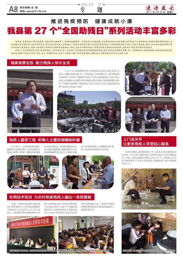 在第27个全国助残日之际,县残联通过一系列活动,进一步弘扬了中华民族扶弱助残的传统美德,逐步形成全社会都来理解、关心、帮助残疾人的良好氛围,营造扶残助残的社会风尚,增强了残疾人自尊、自信、自立、自强的信念,也让广大居民了解了残疾重在预防,健康向上、乐观的生活方式可以成就小康。