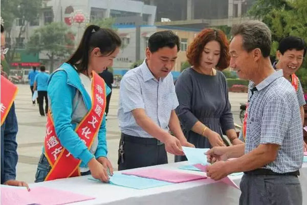 本报讯 6月10日是全国首个"文化和自然遗产日"。今年遗产日非遗宣传展示活动的主题为"非遗保护——传承发展的生动实践",口号为"保护非遗——在生活中弘扬,在实践中振兴""保护传承非遗,展现生活智慧""活力社区,活态非遗""振兴中国传统工艺"。当天,县文化局局长都俊杰、局工会主席吉永红等在县电影院广场为过往群众发放宣传资料,普及非遗知识。