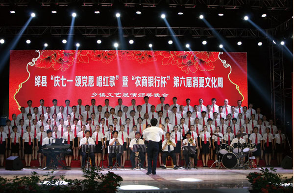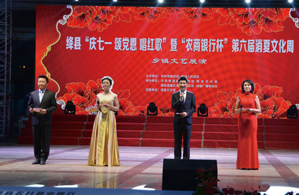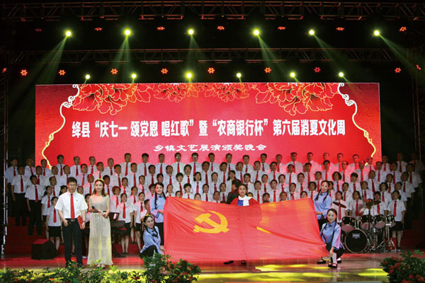 6月26日至7月1日,由县委、县政府主办,县委宣传部、县文化局、县直机关工作委员会、县广播电视台承办,县文化馆组织实施的"庆七一、颂党恩、唱红歌"暨绛县第六届"农商银行杯"消夏文化活动周在县电影院精彩上演,我县东片的五个乡镇,安峪镇、大交镇、南樊镇、卫庄镇和磨里镇分别呈现了一台主题突出、精彩纷呈、寓教于乐的晚会,炎炎夏日里为我县城乡居民送上了一道道消夏解暑的文化大餐。