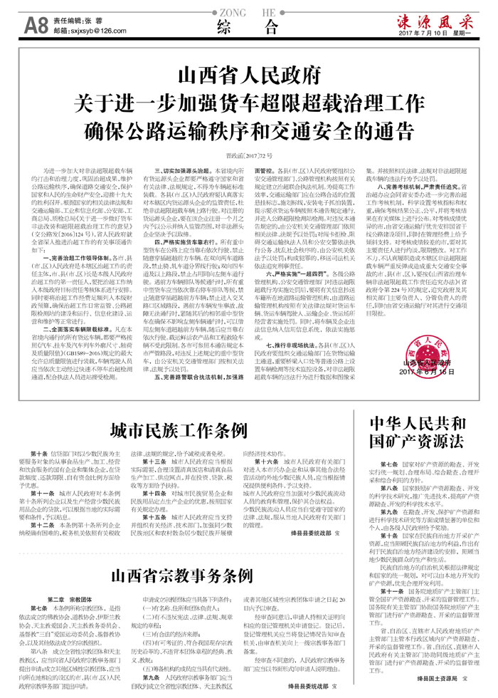 山西省人民政府关于进一步加强货车超限超载治理工作确保公路运输秩序和交通安全的通告