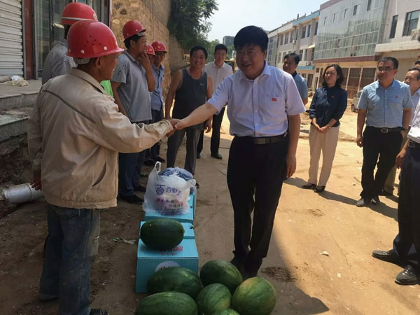 连日来,骄阳似火,酷暑难当,我县进入36℃以上高温天气。但在全县各重点工程建设工地,建设者们顶烈日,冒酷暑,坚守岗位,奋战在高温一线。7月13日,县委书记王宏伟,县委副书记、县长薛玉马分别带队到我县重点项目建设工地,看望慰问一线工人,并送去矿泉水、毛巾等防暑用品。县领导丁格、李服役、解伟龙、薛俊辉等一同前往。要闻·A2版