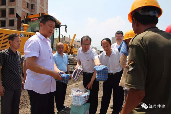 本报讯 连日来,骄阳似火,酷暑难当,我县进入36℃以上高温天气。但在全县各重点工程建设工地,建设者们顶烈日,冒酷暑,坚守岗位,奋战在高温一线。7月13日,县委书记王宏伟,县委副书记、县长薛玉马分别带队到我县重点项目建设工地,看望慰问一线工人,并送去矿泉水、毛巾等防暑用品。县领导丁格、李服役、解伟龙、薛俊辉等一同前往。