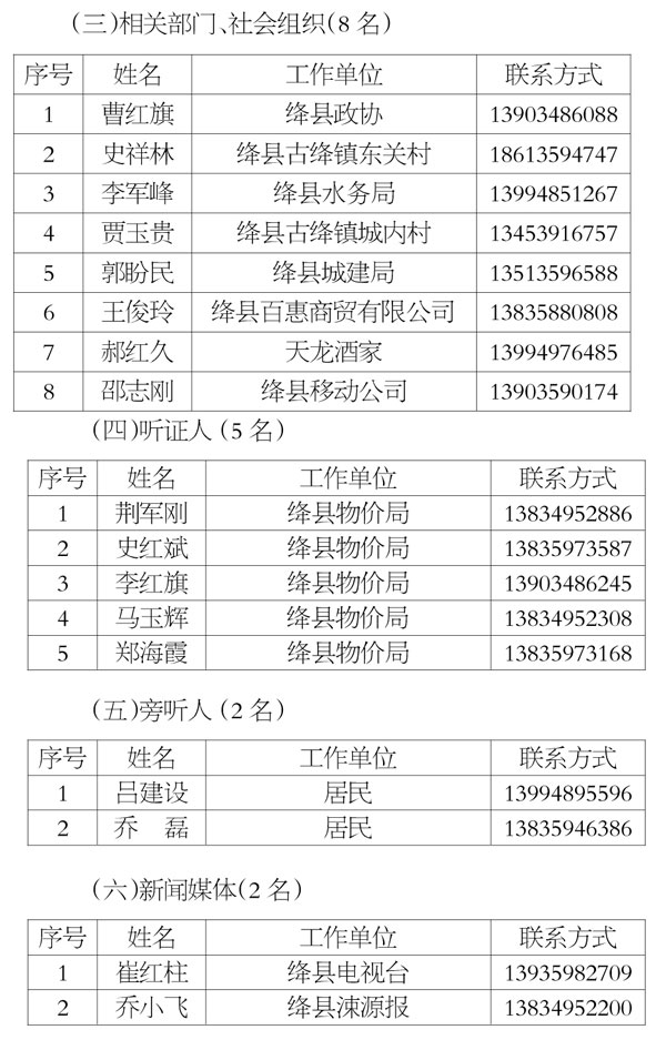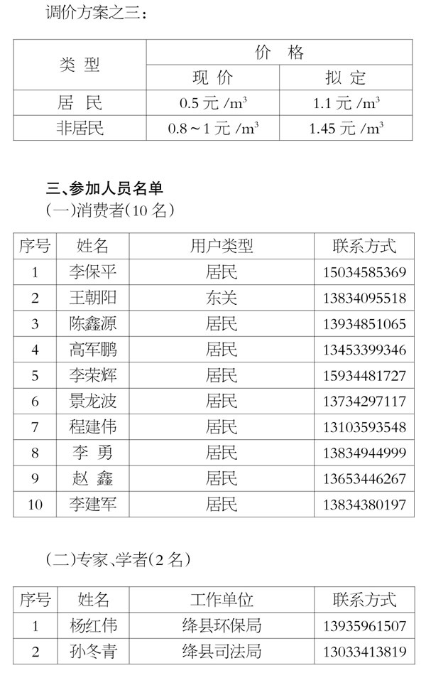 按照《中华人民共和国价格法》、《政府制定价格听证办法》的有关规定,现就调整绛县县城居民生活用水价格听证会的举行时间、地点,听证方案要点,以及听证会参加人、听证人、旁听人名单公告如下: