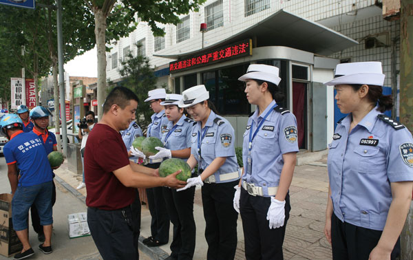 本报讯 7月27日,"绛县同城"公司开展了"奉献爱心 慰问城市一线工作者"活动,为我县公安局交警、环卫工人、城市监察大队人员送去了西瓜、毛巾、矿泉水等消暑用品,感谢他们为城市的辛勤付出。