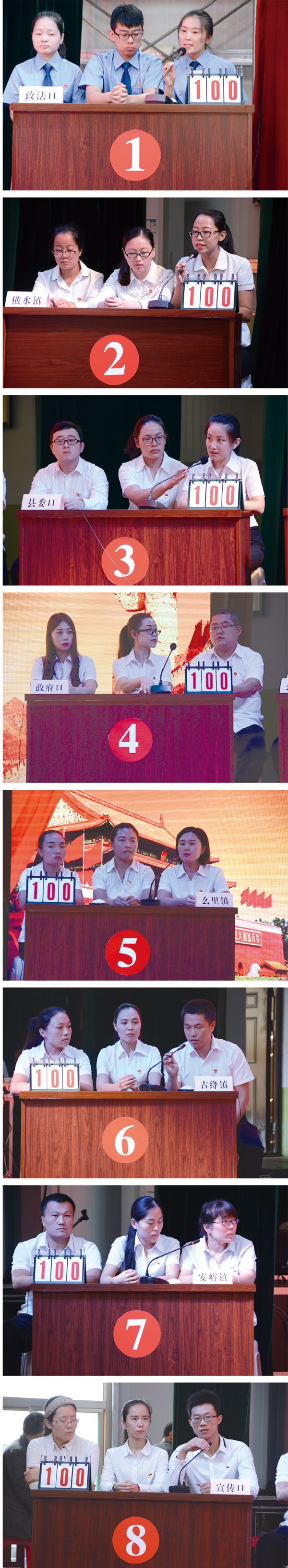 竞赛分为初赛和决赛两个阶段,经过激烈的角逐,县委口、政府口、政法口、宣传口等8支代表队从20支参赛队伍中脱颖而出进入决赛。