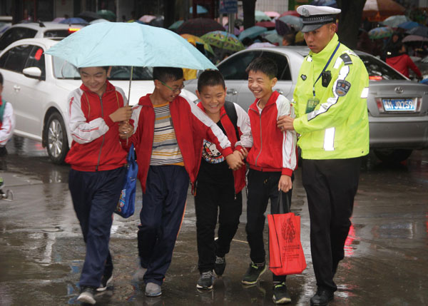 正迎开学季却阴雨连绵,学校门前路段车辆行人川流不息,为保障全县广大学生的交通安全,进一步加强交警安全护学,县交警大队从维护学校周边交通秩序、指挥过往车辆有序礼让、加强学生的交通安全宣传、接送学生车辆的安全管理具体措施入手,认真做好安全护学工作,确保校园周边道路交通安全、有序,切实保障学生的出行安全。大队执勤民警尽职尽责指挥车辆、疏导交通、护送学生,驾驶人雨中视线受阻,民警提醒他们小心学生、行人,路面湿滑,并亲自护送学生到安全区域。民警们的付出得到了广大驾驶员、在校师生和家长们的一致好评。